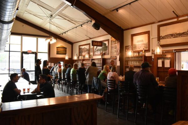 The main bar at the ole Civil Life Brewing Company was designed as a space in which people could be brought together. There are many influences in our space. The narrow chalk board that runs the bars’ length was inspired by a tapas bar in Sevilla, Spain that tabs were kept directly upon. For many of our earlier years, entire customer tabs were kept on this chalk board. Once a patron, passed from occasional or sometimes to regular known by all the staff, we would then keep track of their tab with their name only as they enjoyed their evening. Back in those days, we only accepted cash. Since 2019 we have taken credit cards. The Arts and Crafts style woodwork takes inspiration from bars of the past where woodworkers spent weeks building pubs so they could spend months in them. As you’ll find here, a lot of what has happened at the Civil Life comes through a talented group of Civil Life supporters. All the woodwork was done by our friend and regular Jim Wholrabe. Jim’s joke has always been, “Come for the woodwork, stay for the beer!” The pictures behind the bar, beckon St. Louis’ vibrant days and include a rare 1860’s 10 foot wide print of the riverfront, A welcome to St. Louis sign on the no longer vehicular MacArthur Bridge, The beautiful building that once stood at Chippewa and Kingshighway only to be replaced by a Jack in the Box and the once beautiful building that stood at the corner of Grand and Arsenal which is now a Qdoba.