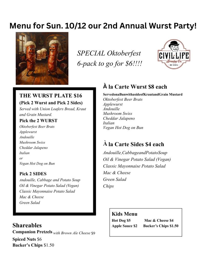 We are having our 2nd Annual Wurst Party this Sunday, October 12th. The entire Menu for the day is posted and is different than our normal Sunday Menu…. well that is until Soups start on November 2nd! We are always thankful for those that show up to our events! It means the world to us. This also gets you in the habit of coming on Sundays again!